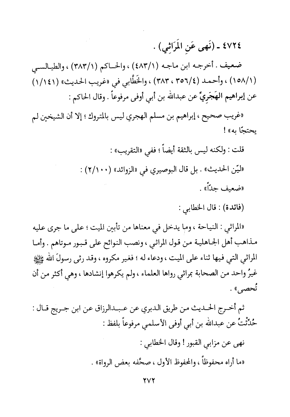 "المراثي: النياحة، وما يدخل في معناها من تأبين الميت؛ على ما جرى عليه مذاهب أهل الجاهلية من قول المراثي، ونصب النوائح على قبور موتاهم. وأما المراثي التي فيها ثناء على الميت، ودعاء له؛ فغير مكروه، وقد رثى رسول الله - صلى الله عليه وسلم - غير واحد من الصحابة بمراثي رواها العلماء، ولم يكرهوا إنشادها، وهي أكثر من أن تحصى".