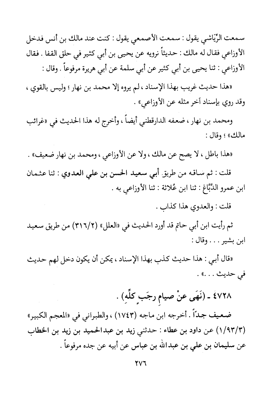 "هذا باطل، لا يصح عن مالك، ولا عن الأوزاعي، ومحمد بن نهار ضعيف".