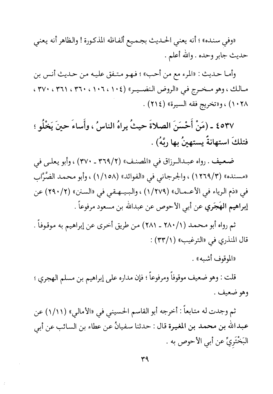 رواه عبد الرزاق في "المصنف" (2/ 369-370) ، وأبو يعلى في "مسنده" (3/ 1269) ، والجرجاني في "الفوائد" (158/ 1) ، وأبو محمد الضراب في "ذم الرياء في الأعمال" (279/ 1) ، والبيهقي في "السنن" (2/ 290) عن إبراهيم الهجري عن أبي الأحوص عن عبد الله بن مسعود مرفوعاً.
