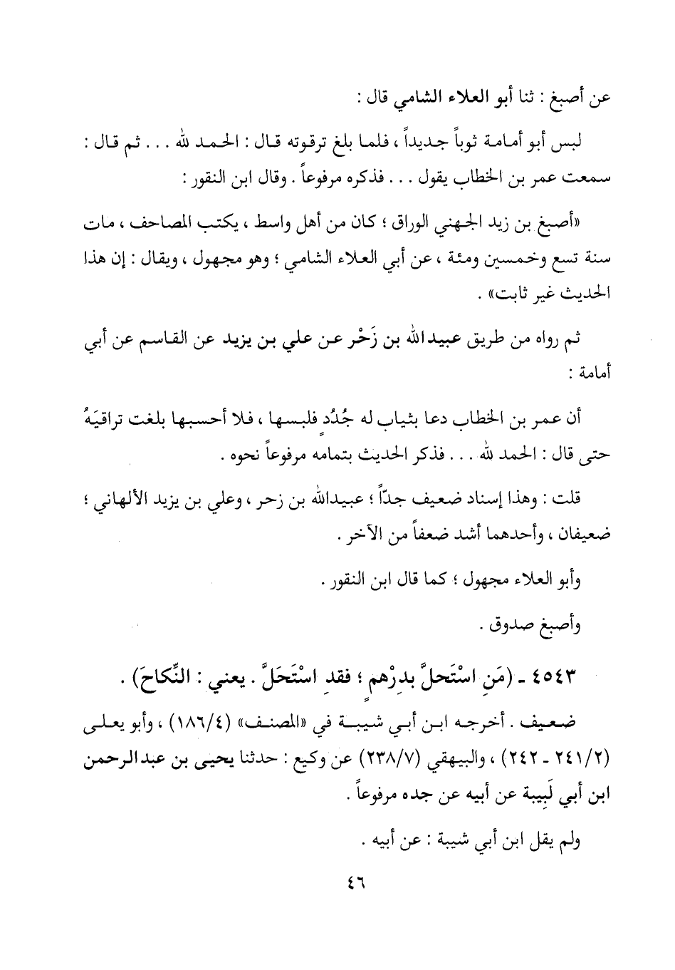 لبس أبو أمامة ثوباً جديداً، فلما بلغ ترقوته قال: الحمد لله ... ثم قال: سمعت عمر بن الخطاب يقول ... فذكره مرفوعاً. وقال ابن النقور: