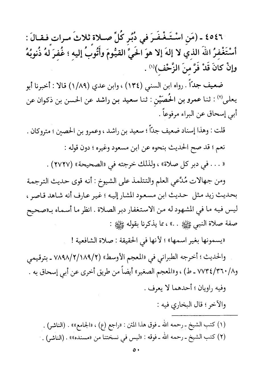 ومن جهالات مدعي العلم والتتلمذ على الشيوخ: أنه قوى حديث الترجمة بحديث زيد مثل حديث ابن مسعود المشار إليه؛ غير عارف أنه شاهد قاصر، ليس فيه ما في المشهود له من الاستغفار دبر الصلاةت. انظر ما أسماه بـ "صحيح صفة صلاة النبي - صلى الله عليه وسلم -.."، مما يذكرنا بقوله - صلى الله عليه وسلم -: