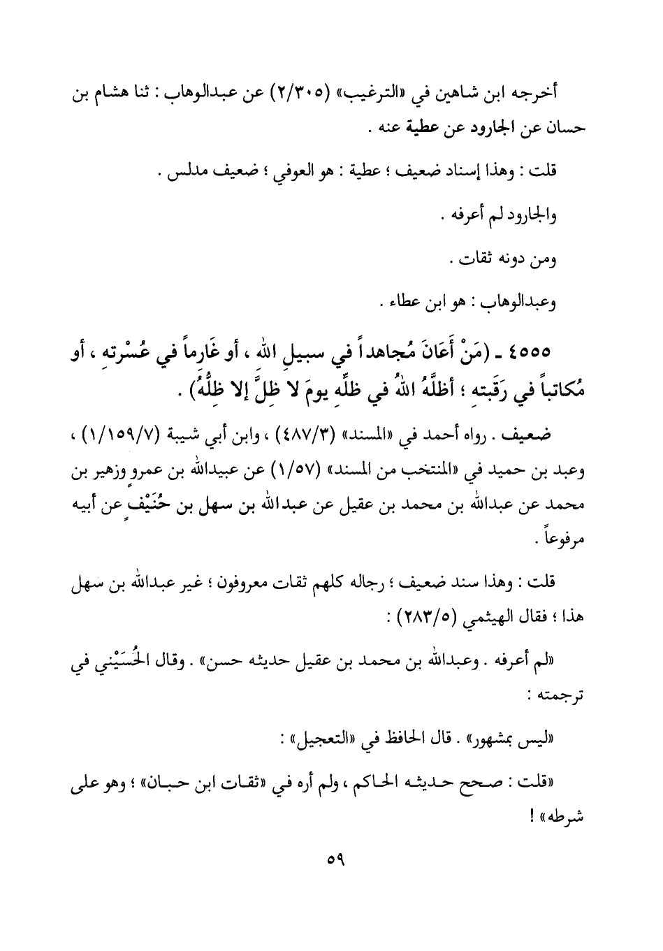 4555 - (من أعان مجاهداً في سبيل الله، أو غارماً في عسرته، أو مكاتباً في رقبته؛ أظله الله في ظله يوم لا ظل إلا ظله) .