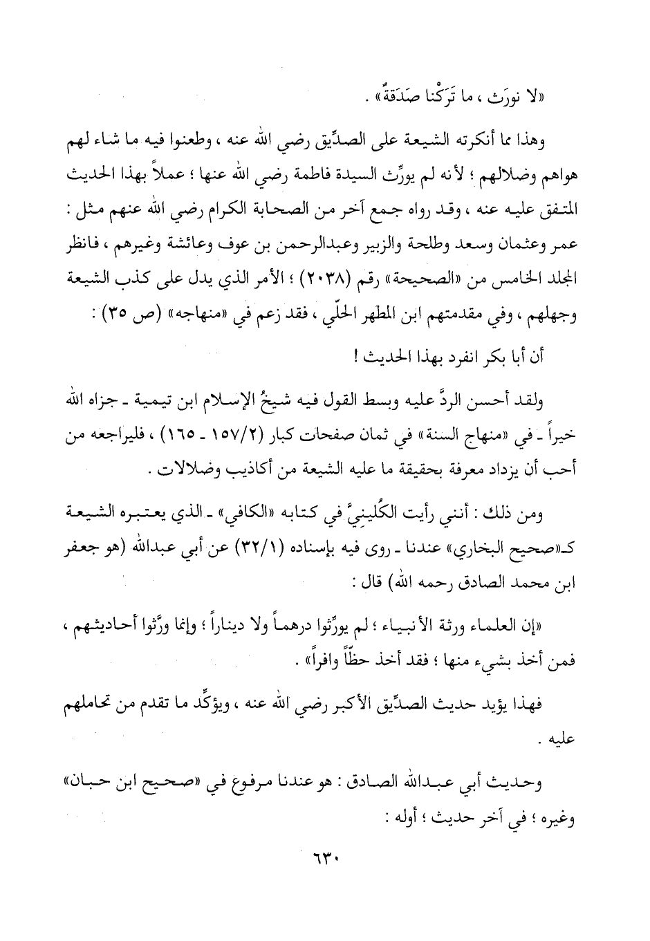 وهذا مما أنكرته الشيعة على الصديق رضي الله عنه، وطعنوا فيه ما شاء لهم هواهم وضلالهم؛ لأنه لم يورث السيدة فاطمة رضي الله عنها؛ عملاً بهذا الحديث المتفق عليه عنه، وقد رواه جمع آخر من الصحابة الكرام رضي الله عنهم مثل: عمر وعثمان وسعد وطلحة والزبير وعبد الرحمن بن عوف وعائشة وغيرهم، فانظر المجلد الخامس من "الصحيحة" رقم (2038) ؛ الأمر الذي يدل على كذب الشيعة وجهلهم، وفي مقدمتهم ابن المطهر الحلي، فقد زعم في "منهاجه" (ص 35) :