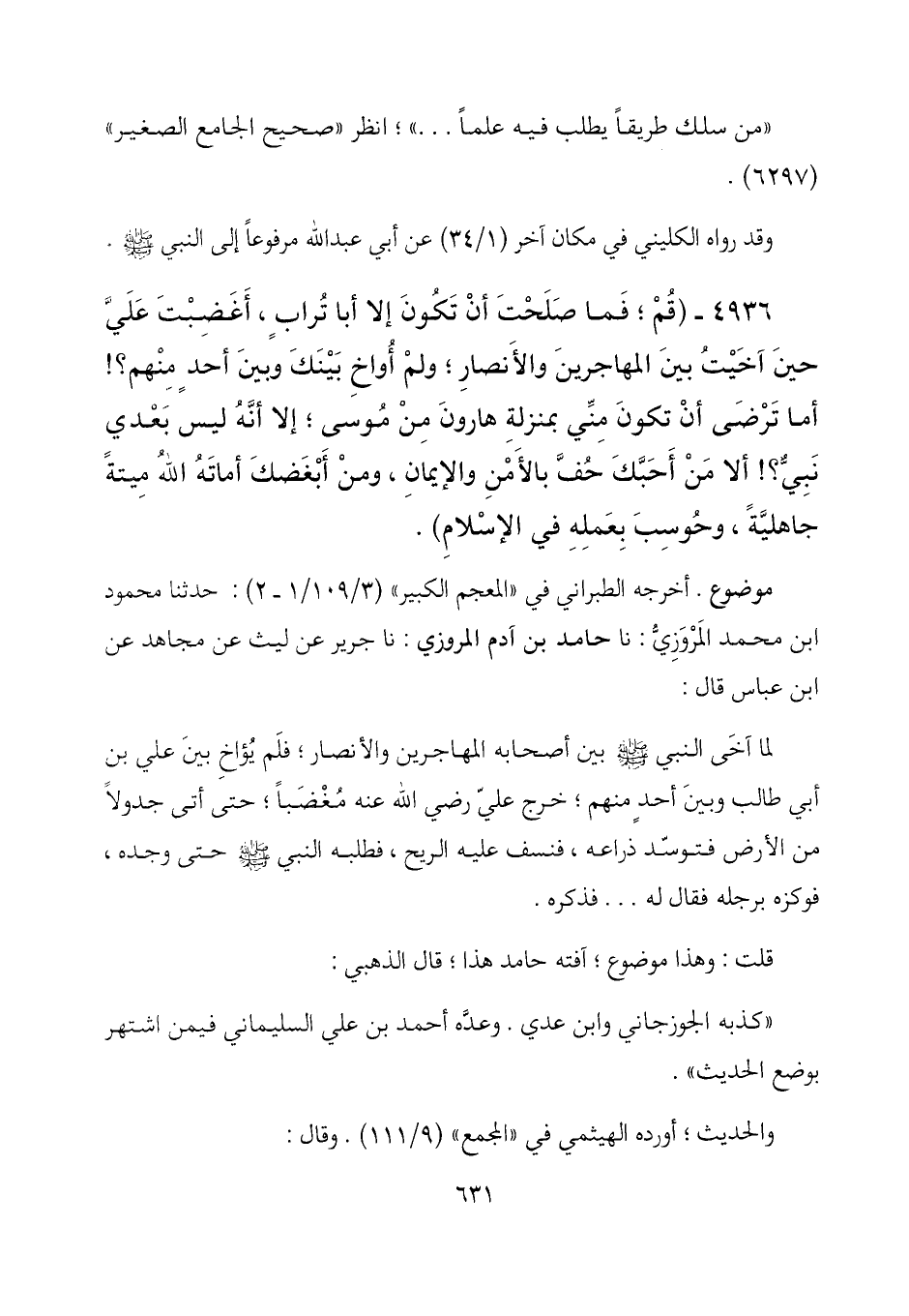 4936 - (قم؛ فما صلحت أن تكون إلا أبا تراب، أغضبت علي حين آخيت بين المهاجرين والأنصار؛ ولم أواخ بينك وبين أحد منهم؟! أما ترضى أن تكون مني بمنزلة هارون من موسى؛ إلا أنه ليس بعدي نبي؟! ألا من أحبك حف بالأمن والإيمان، ومن أبغضك أماته الله ميتةً جاهليةً، وحوسب بعمله في الإسلام) .