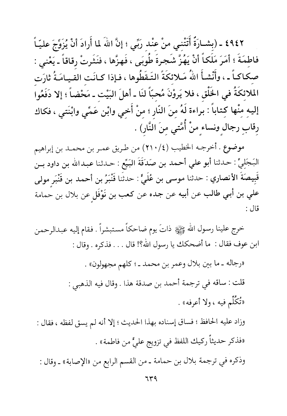 4942 - (بشارة أتتني من عند ربي؛ إن الله لما أراد أن يزوج علياً فاطمة؛ أمر ملكاً أن يهز شجرة طوبى، فهزها، فنثرت رقاقاً - يعني: صكاكاً -، وأنشأ الله ملائكة التقطوها، فإذا كانت القيامة ثارت الملائكة في الخلق، فلا يرون محباً لنا - أهل البيت - محضاً؛ إلا دفعوا إليه منها كتاباً: براءة له من النار؛ من أخي وابن عمي وابنتي، فكاك رقاب رجال ونساء من أمتي من النار) .