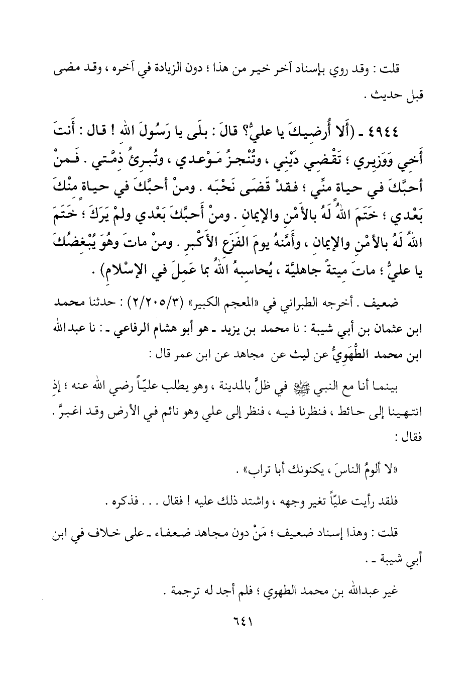 4944 - (ألا أرضيك يا علي؟ قال: بلى يا رسول الله! قال: أنت أخي ووزيري؛ تقضي ديني، وتنجز موعدي، وتبرىء ذمتي. فمن أحبك في حياة مني؛ فقد قضى نحبه. ومن أحبك في حياة منك بعدي؛ ختم الله له بالأمن والإيمان. ومن أحبك بعدي ولم يرك؛ ختم الله له بالأمن والإيمان، وأمنه يوم الفزع الأكبر. ومن مات وهو يبغضك يا علي؛ مات ميتة جاهلية، يحاسبه الله بما عمل في الإسلام) .