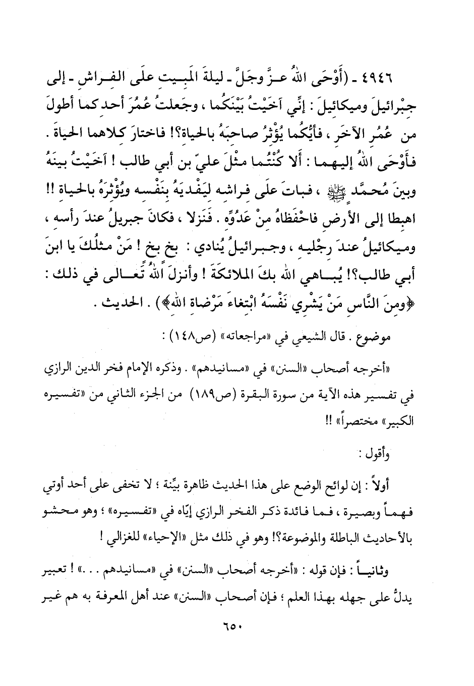 أولاً: إن لوائح الوضع على هذا الحديث ظاهرة بينة؛ لا تخفى على أحد أوتي فهماً وبصيرة، فما فائدة ذكر الفخر الرازي إياه في "تفسيره"؛ وهو محشو بالأحاديث الباطلة والموضوعة؟! وهو في ذلك مثل "الإحياء" للغزالي!