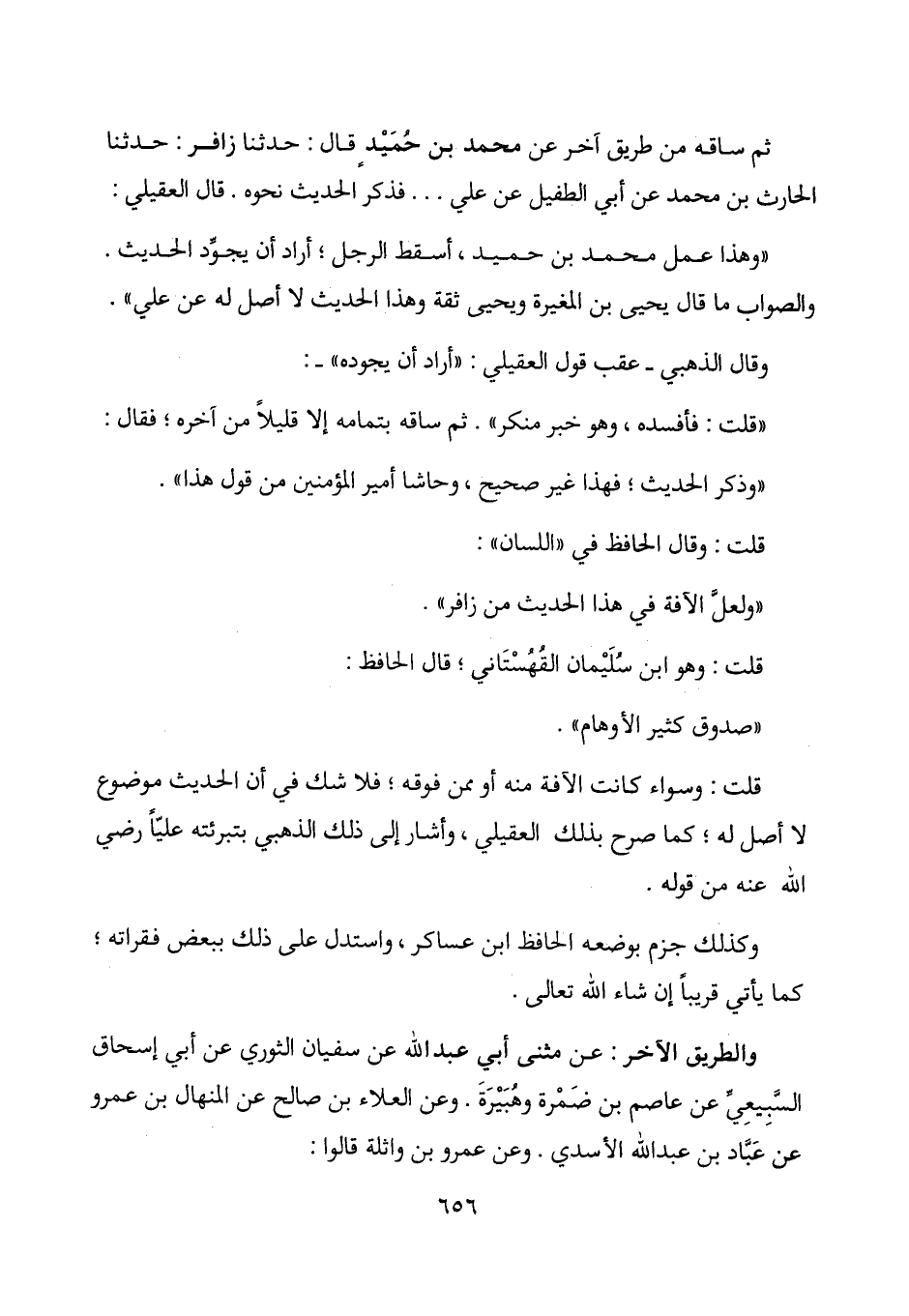 ثم ساقه من طريق آخر عن محمد بن حميد قال: حدثنا زافر: حدثنا الحارث بن محمد عن أبي الطفيل عن علي ... فذكر الحديث نحوه. قال العقيلي: