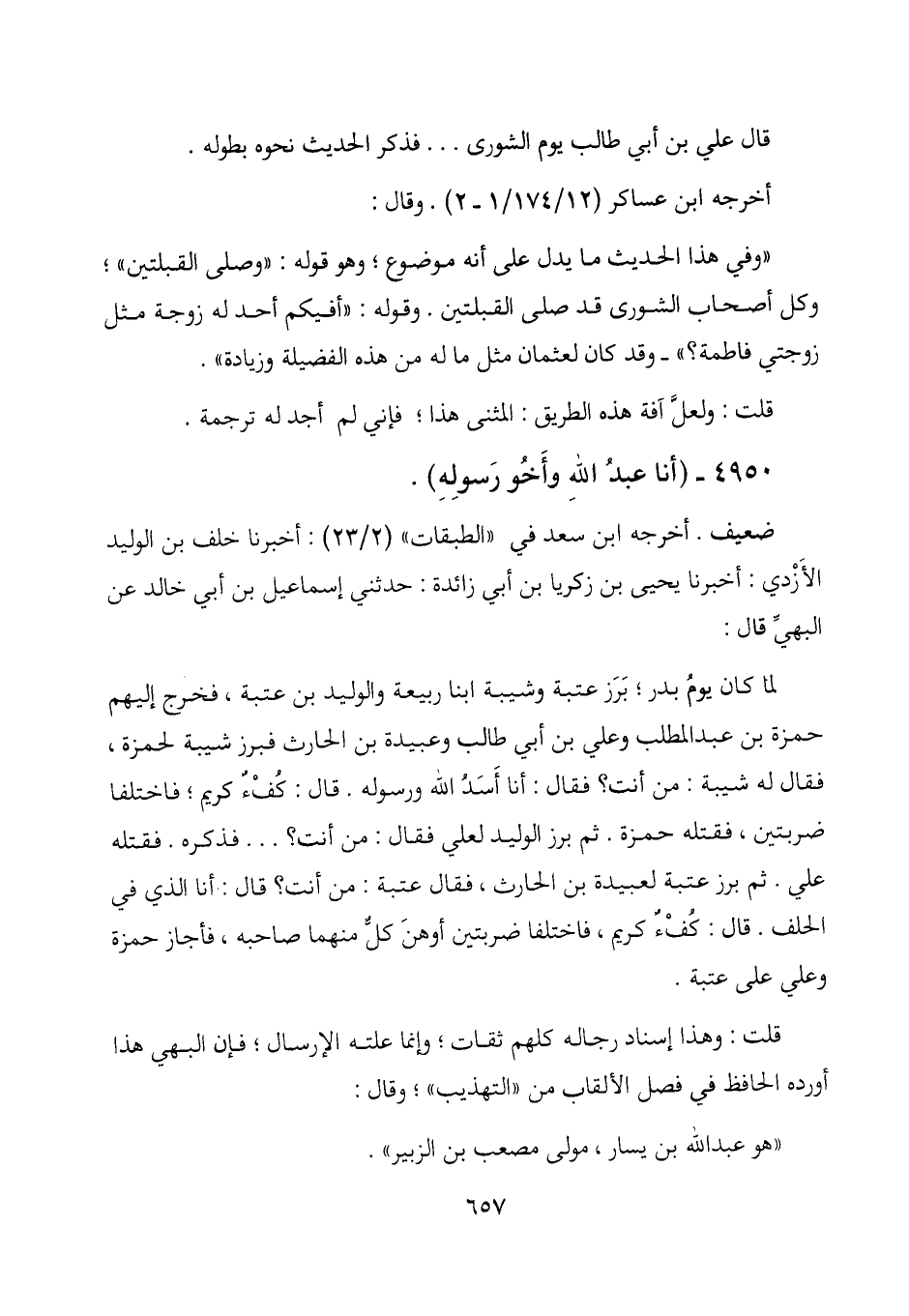 "وفي هذا الحديث ما يدل على أنه موضوه؛ وهو قوله: "وصلى القبلتين"؛ وكل أصحاب الشورى قد صلى القبلتين. وقوله: "أفيكم أحد له زوجة مثل زوجتي فاطمة؟ " - وقد كان لعثمان مثل ما له من هذه الفضيلة وزيادة".