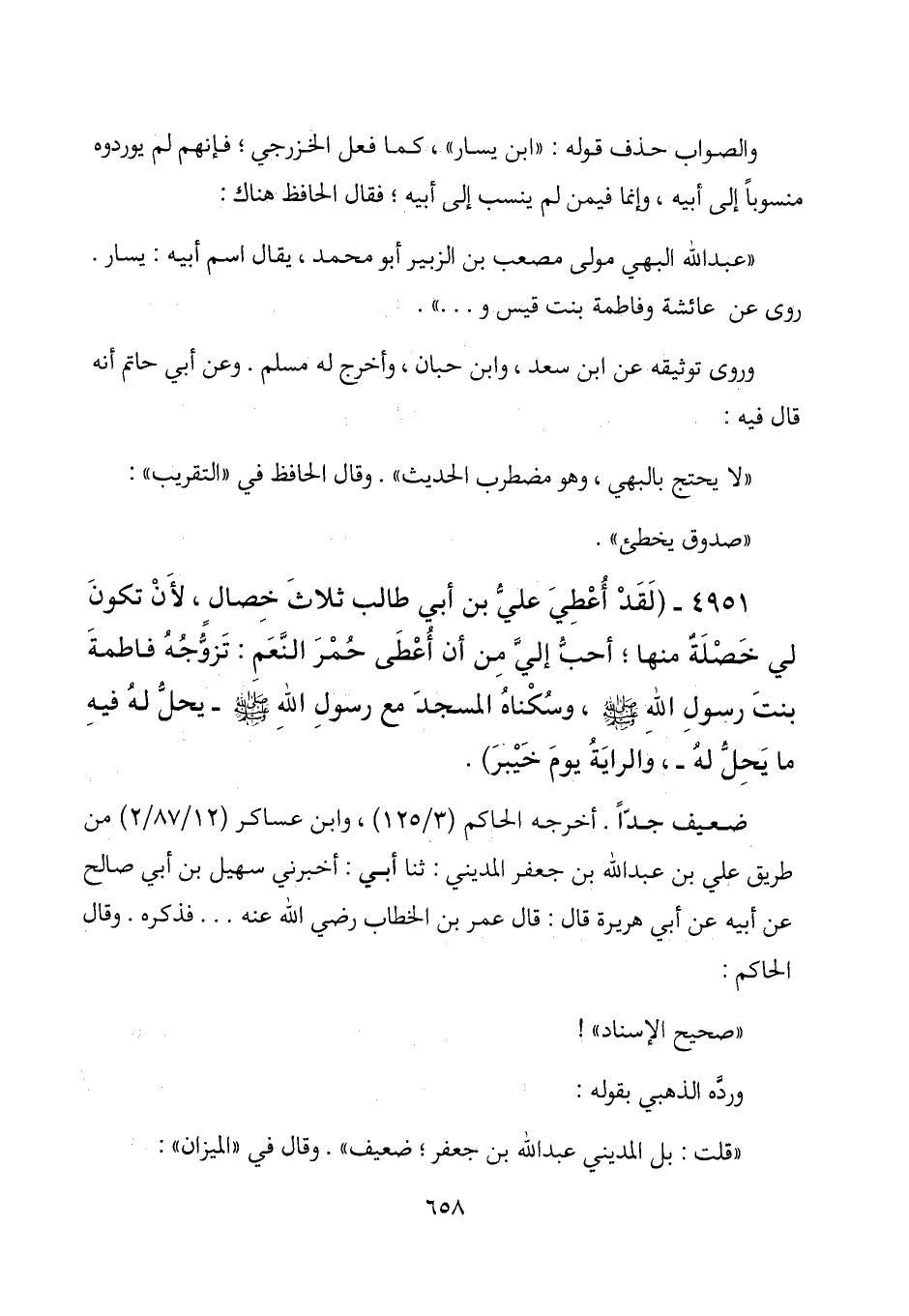 "قلت: بل المديني عبد الله بن جعفر؛ ضعيف". وقال في "الميزان":