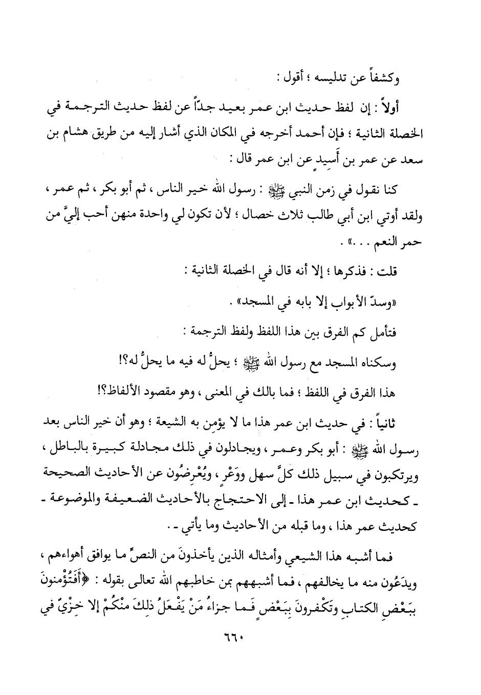 ثانياً: في حديث ابن عمر هذا ما لا يؤمن به الشيعة؛ وهو أن خير الناس بعد رسول الله - صلى الله عليه وسلم -: أبو بكر وعمر، ويجادلون في ذلك مجادلة كبيرة بالباطل، ويرتكبون في سبيل ذلك كل سهل ووعر، ويعرضون عن الأحاديث الصحيحة - كحديث ابن عمر هذا - إلى الاحتجاج بالأحاديث الضعيفة والموضوعة - كحديث عمر هذا، وما قبله من الأحاديث وما يأتي -.