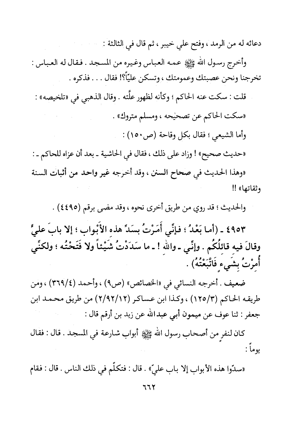 4953 - (أما بعد؛ فإني أمرت بسد هذه الأبواب؛ إلا باب علي وقال فيه قائلكم. وإني - والله! - ما سددت شيئاً ولا فتحته؛ ولكني أمرت بشيء فاتبعته) .