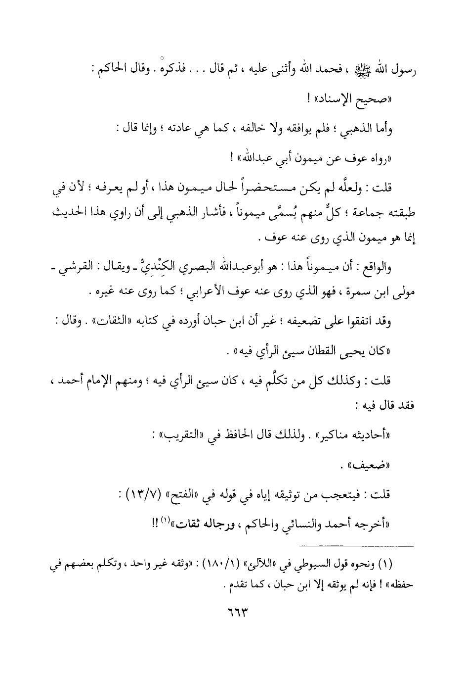 قلت: ولعله لم يكن مستحضراً لحال ميمون هذا، أو لم يعرفه؛ لأن في طبقته جماعة؛ كل منهم يسمى ميموناً، فأشار الذهبي إلى أن راوي هذا الحديث إنما هو ميمون الذي روى عنه عوف.