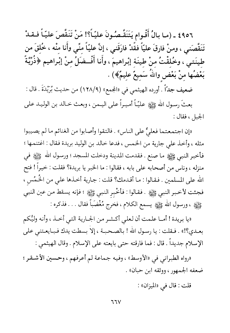 4956 - (ما بال أقوام يتنقصون علياً؟! من تنقص علياً فقد تنقصني، ومن فارق علياً فقد فارقني، إن علياً مني وأنا منه، خلق من طينتي، وخلقت من طينة إبراهيم، وأنا أفضل من إبراهيم (ذرية بعضها من بعض والله سميع عليم)) .