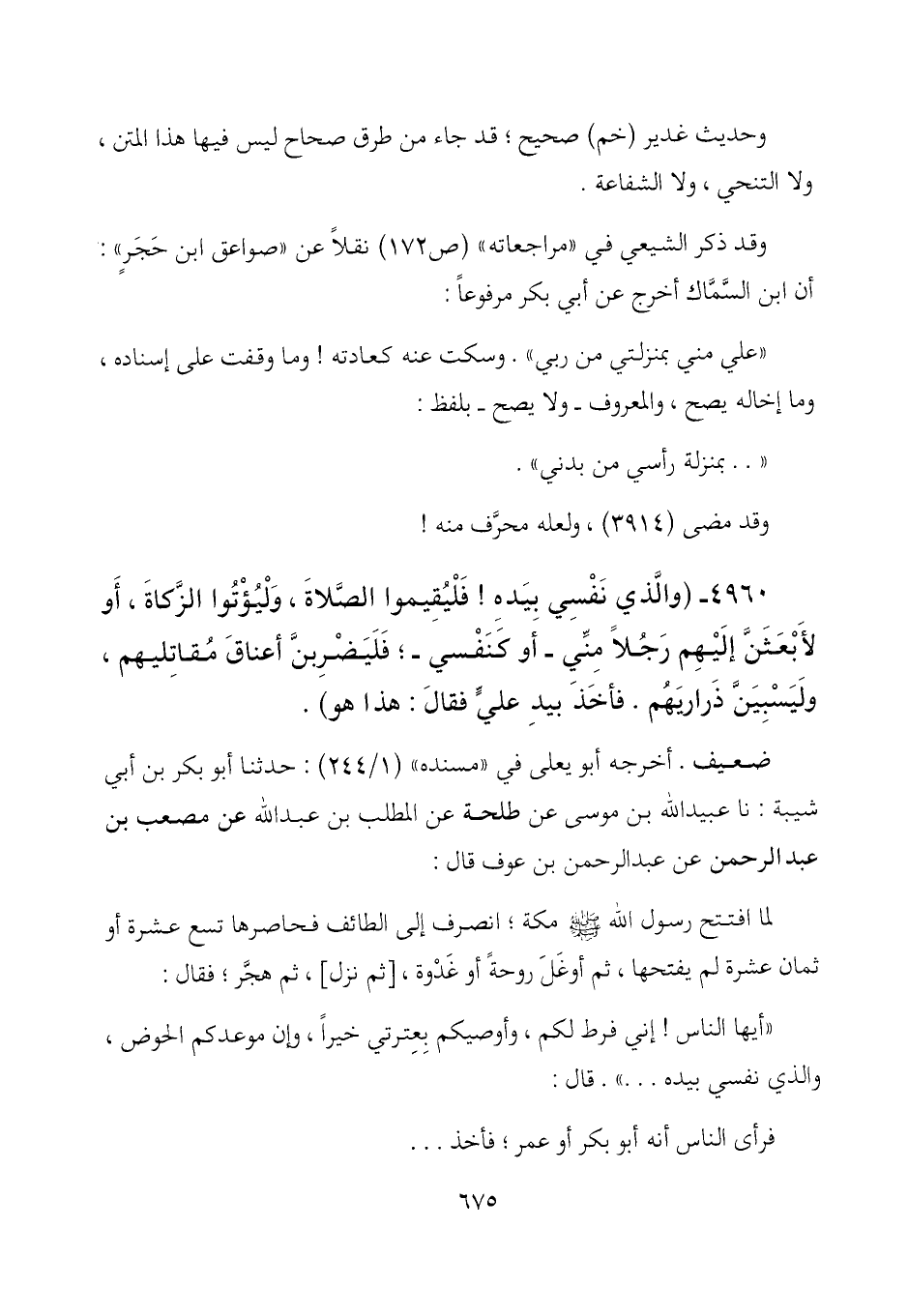 وقد ذكر الشيعي في "مراجعاته" (ص 172) نقلاً عن "صواعق ابن حجر": أن ابن السماك أخرج عن أبي بكر مرفوعاً: