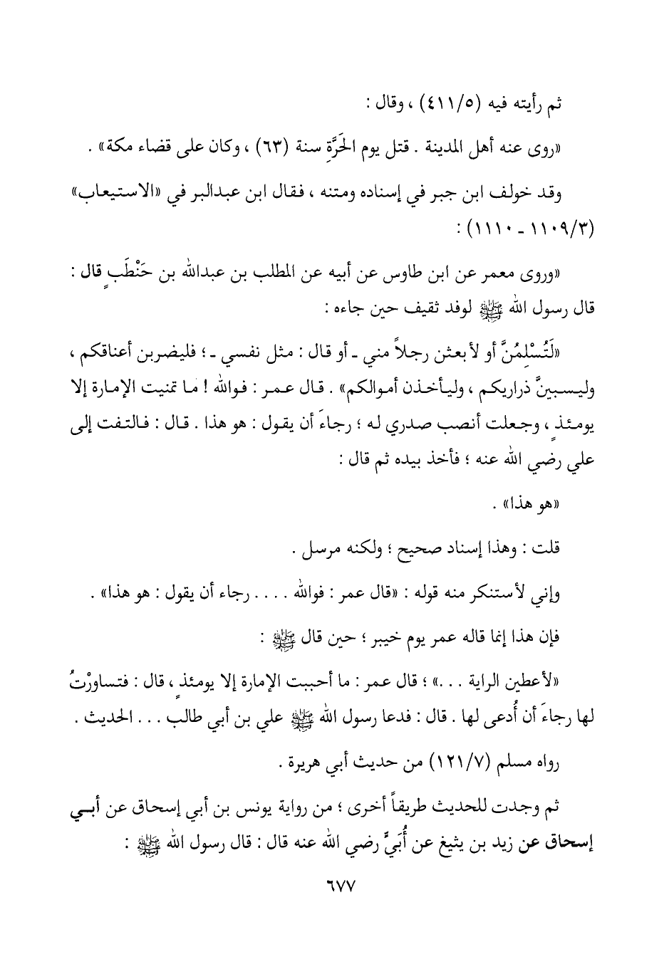 "لتسلمن أو لأبعثن رجلاً مني - أو قال: مثل نفسي -؛ فليضربن أعناقكم، وليسبين ذراريكم، وليأخذن أموالكم". قال عمر: فوالله! ما تمنيت الإمارة إلا يومئذ، وجعلت أنصب صدري له؛ رجاء أن يقول: هو هذا. قال: فالتفت إلى علي رضي الله عنه؛ فأخذ بيده ثم قال: