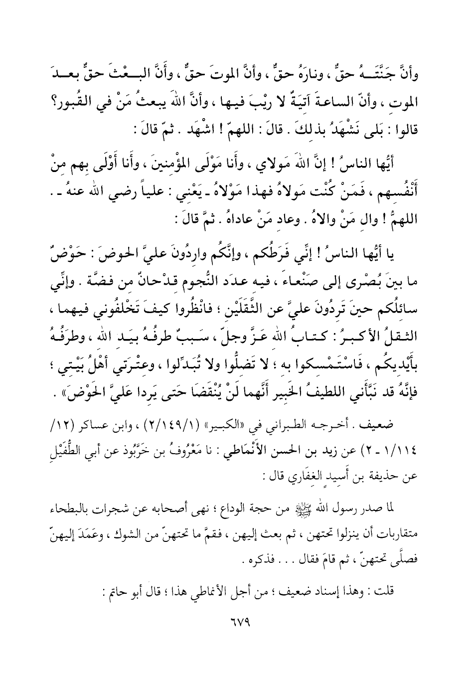 يا أيها الناس! إني فرطكم، وإنكم واردون علي الحوض: حوض ما بين بصري إلى صنعاء، فيه عدد النجوم قدحان من فضة. وإني سائلكم حين تردون علي عن الثقلين؛ فانظروا كيف تخلفوني فيهما، الثقل الأكبر: كتاب الله عز وجل، سبب طرفه بيد الله، وطرفه بأيديكم، فاستمسكوا به؛ لا تضلوا ولا تبدلوا، وعترتي أهل بيتي؛ فإنه قد نبأني اللطيف الخبير أنهما لن ينقضا حتى يردا علي الحوض".