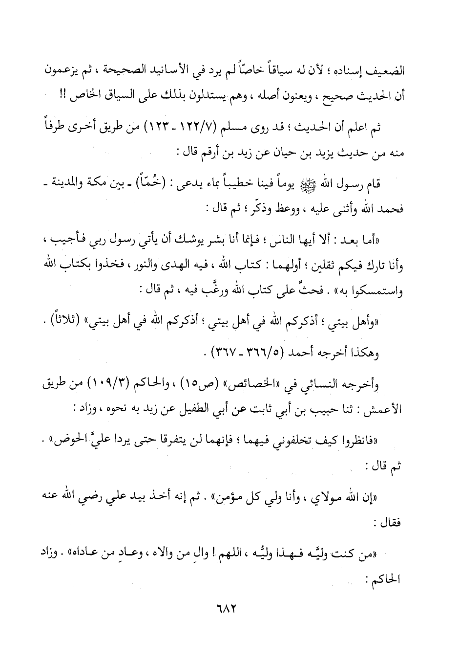 "أما بعد: ألا أيها الناس؛ فإنما أنا بشر يوشك أن يأتي رسول ربي فأجيب، وأنا تارك فيكم ثقلين؛ أولهما: كتاب الله، فيه الهدى والنور، فخذوا بكتاب الله واستمسكوا به". فحث على كتاب الله ورغب فيه، ثم قال: