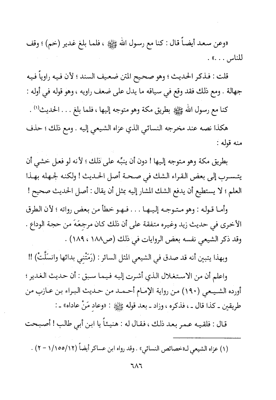 وأما قوله: وهو متوجه إليها ... فهو خطأ من بعض رواته؛ لأن الطرق الأخرى في حديث زيد وغيره متفقة على أن ذلك كان مرجعه من حجة الوداع. وقد ذكر الشيعي نفسه بعض الروايات في ذلك (ص 188،189) .