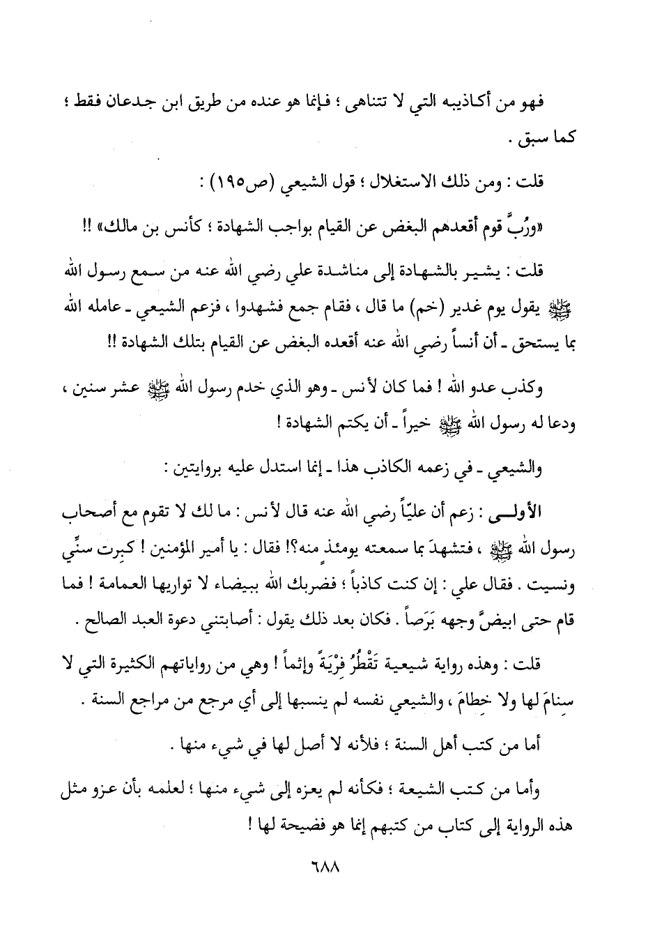 قلت: يشير بالشهادة إلى مناشدة علي رضي الله عنه من سمع رسول الله - صلى الله عليه وسلم - يقول يوم غدير (خم) ما قال، فقام جمع فشهدوا، فزعم الشيعي - عامله الله بما يستحق - أن أنساً رضي الله عنه أقعده البغض عن القيام بتلك الشهادة!!