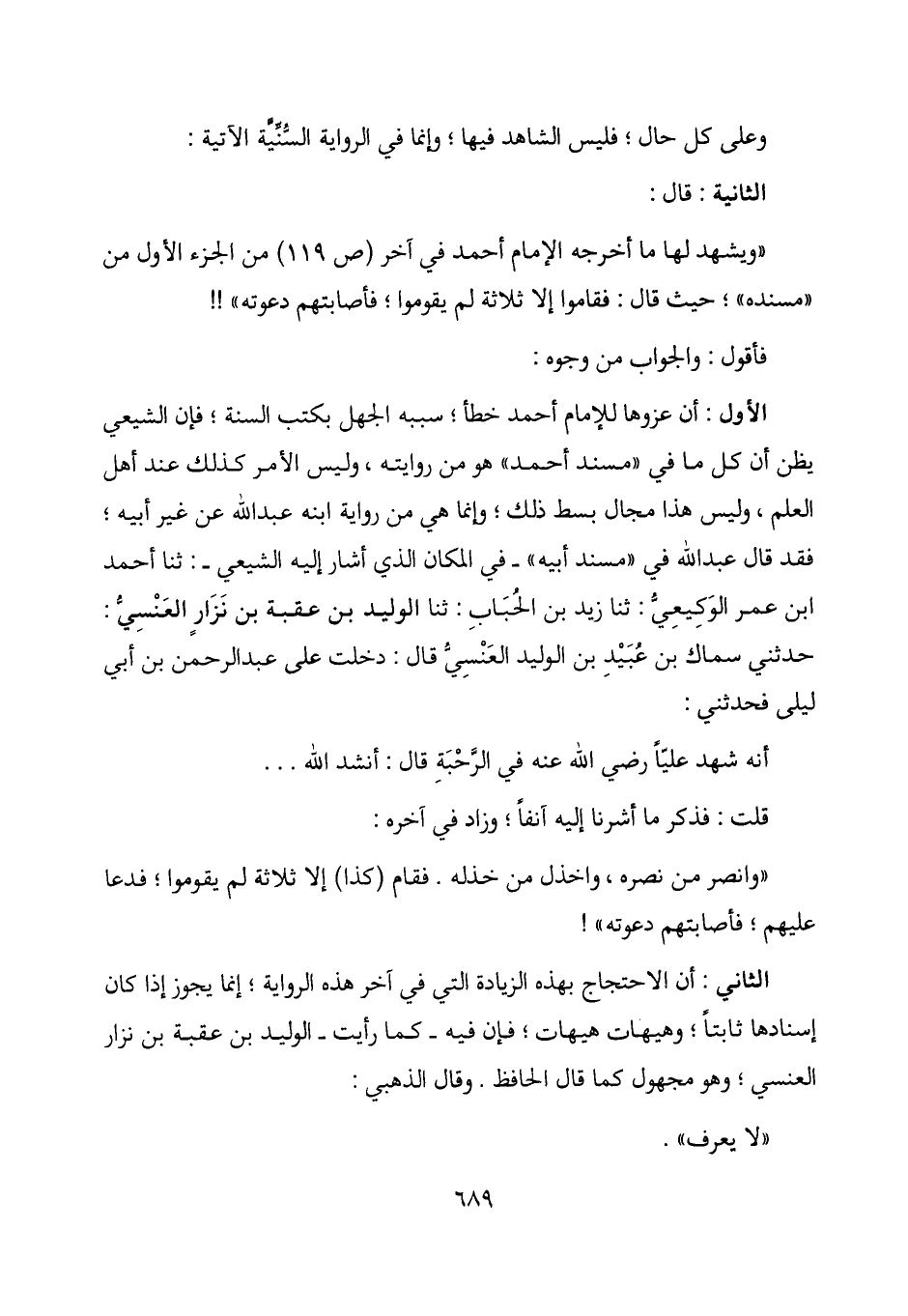 الأول: أن عزوها للإمام أحمد خطأ؛ سببه الجهل بكتب السنة؛ فإن الشيعي يظن أن كل ما في "مسند أحمد" هو من روايته، وليس الأمر كذلك عند أهل العلم، وليس هذا مجال بسط ذلك؛ وإنما هي من رواية ابنه عبد الله عن غير أبيه؛ فقد قال عبد الله في "مسند أبيه" - في المكان الذي أشار إليه الشيعي -: حدثنا أحمد ابن عمر الوكيعي: حدثنا زيد بن الحباب: حدثنا الوليد بن عقبة بن نزار العنسي: حدثني سماك بن عبيد بن الوليد العنسي قال: دخلت على عبد الرحمن بن أبي ليلى فحدثني: