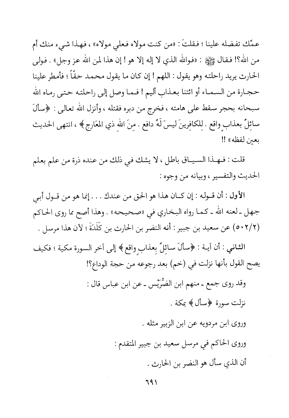 عمك تفضله علينا؛ فقلت: "من كنت مولاه فعلي مولاه"، فهذا شيء منك أم من الله؟! فقال - صلى الله عليه وسلم -: "فوالله الذي لا إله إلا هو! إن هذا لمن الله عز وجل". فولى الحارث يريد راحلته وهو يقول: اللهم! إن كان ما يقول محمد حقاً؛ فأمطر علينا حجارة من السماء أو ائتنا بعذاب أليم! فما وصل إلى راحلته حتى رماه اله سبحانه بحجر سقط على هامته، فخرج من دبره فقتله، وأنزل الله تعالى: (سأل سائل بعذاب واقع. للكافرين ليس له دافع. من الله ذي المعارج) ، انتهى الحديث بعين لفظه"!!