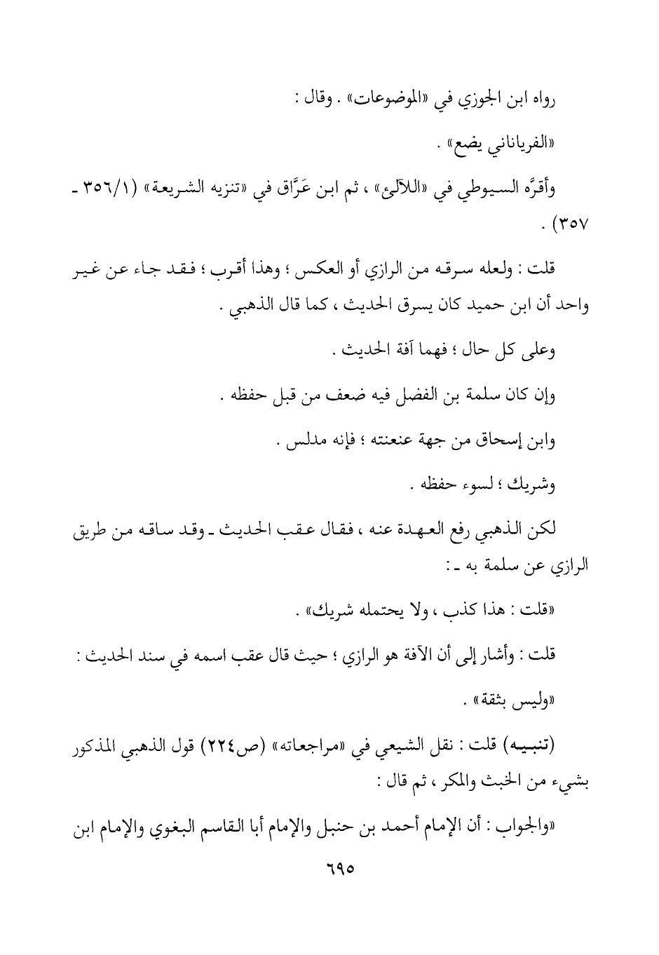 قلت: ولعله سرقه من الرازي أو العكس؛ وهذا أقرب؛ فقد جاء عن غير واحد أن ابن حميد كان يسرق الحديث، كما قال الذهبي.