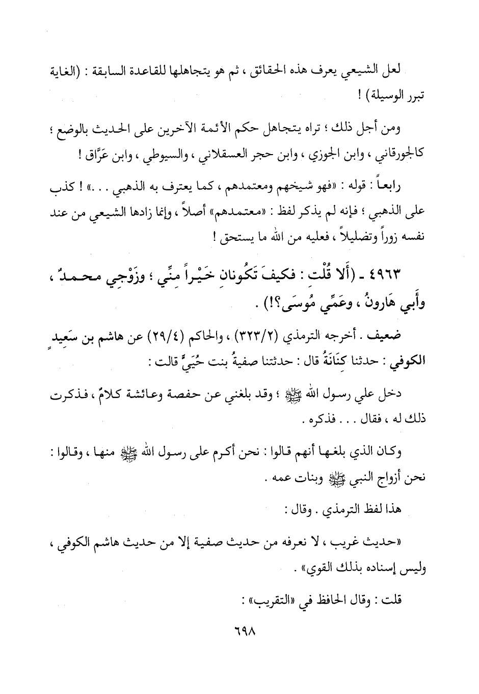 رابعاً: قوله: "فهو شيخهم ومعتمدهم، كما يعترف به الذهبي ... "! كذب على الذهبي؛ فإنه لم يذكر لفظ: "معتمدهم" أصلاً، وإنما زادها الشيعي من عند نفسه زوراً وتضليلاً، فعليه من الله مايستحق!