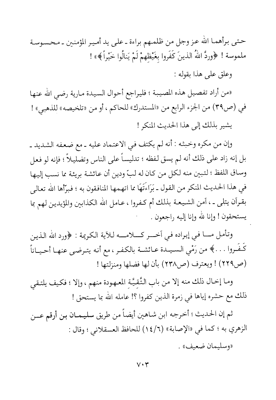 وتأمل ما في إيراده في آخر كلامه للآية الكريمة: (ورد الله الذين كفروا ... ) من رمي السيدة عائشة بالكفر، مع أنه يترضى عنها أحياناً (ص 229) ! ويتعرف (ص 238) بأن لها فضلها ومنزلتها!