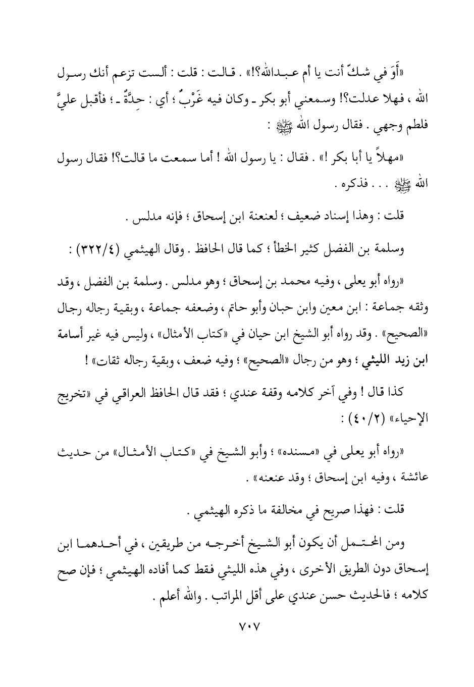 "رواه أبو يعلى في "مسنده"؛ وأبو الشيخ في "كتاب الأمثال" من حديث عائشة، وفيه ابن إسحاق؛ وقد عنعنه".