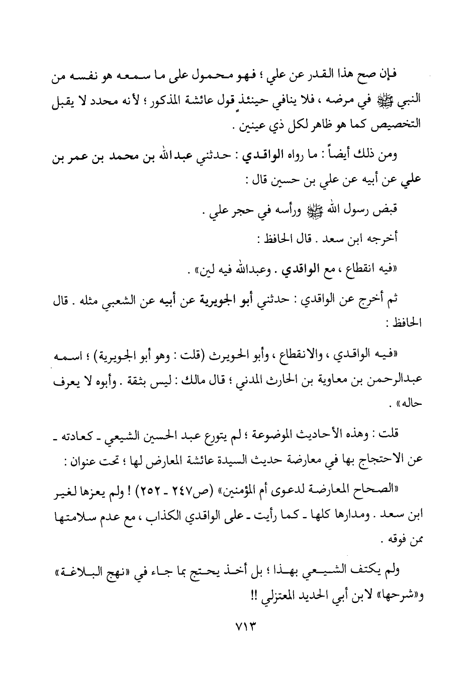 "الصحاح المعارضة لدعوى أم المؤمنين" (ص 247-252) ! ولم يعزها لغير ابن سعد. ومدارها كلها - كما رأيت - على الواقدي الكذاب، مع عدم سلامتها ممن فوقه.