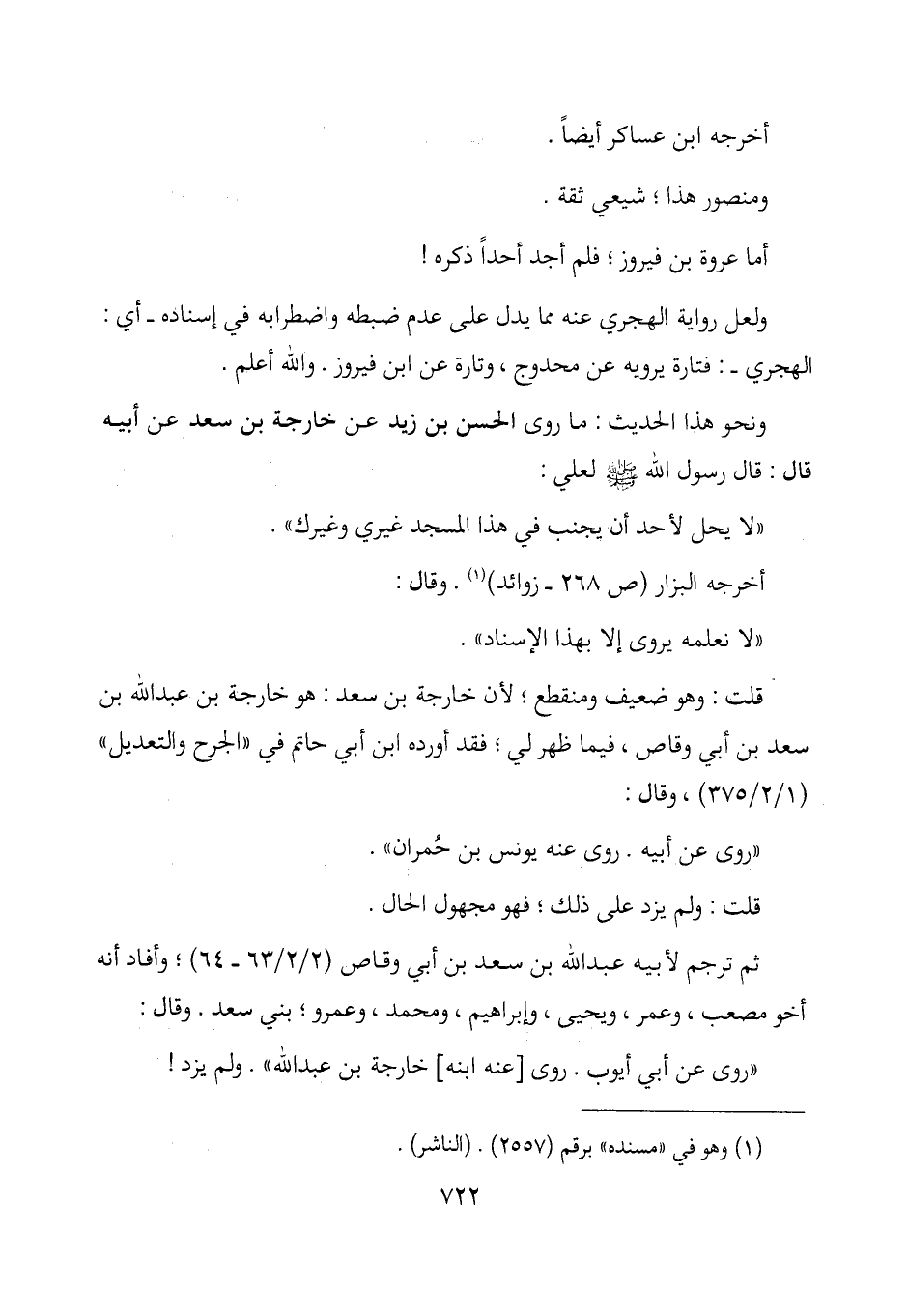 قلت: وهو ضعيف ومنقطع؛ لأن خارجة بن سعد: هو خارجة بن عبد الله بن سعد بن أبي وقاص، فيما ظهر لي؛ فقد أورده ابن أبي حاتم في "الجرح والتعديل" (1/ 2/ 375) ، وقال: