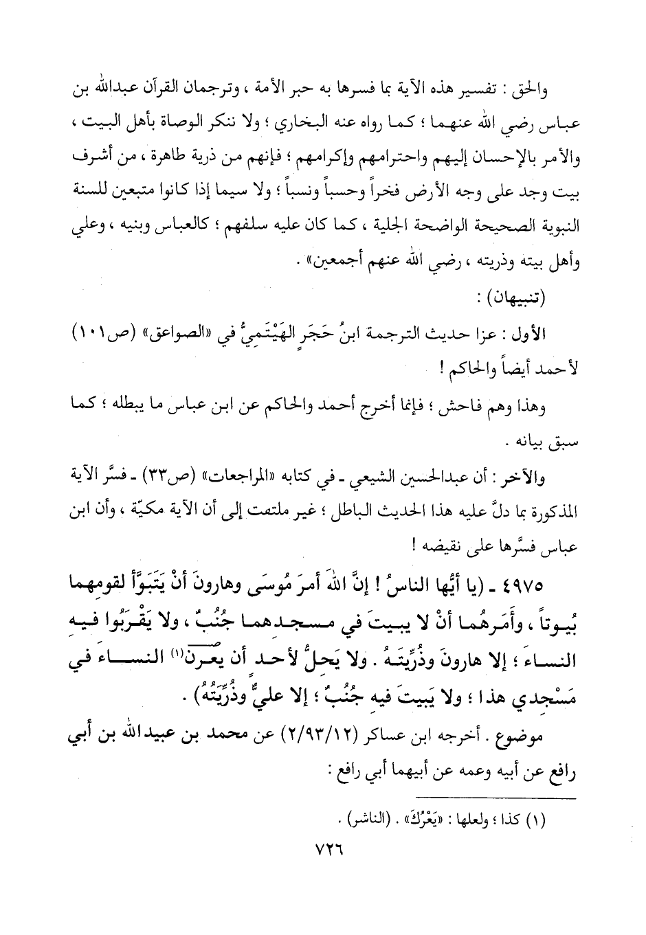 والآخر: أن عبد الحسين الشيعي - في كتابه "المراجعات" (ص 33) - فسر الآية المذكورة بما دل عليه هذا الحديث الباطل؛ غير ملتفت إلى أن الآية مكية، وأن ابن عباس فسرها على نقيضه!