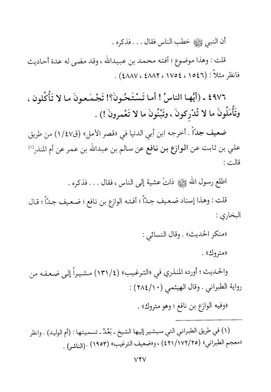 (1) في طريق الطبراني التي سيشير إليها الشيخ - بعدُ - تسميتها: (أم الوليد) . وانظر " معجم الطبراني " (25/172/421) ، و " ضعيف الترغيب " (1953) . (الناشر)