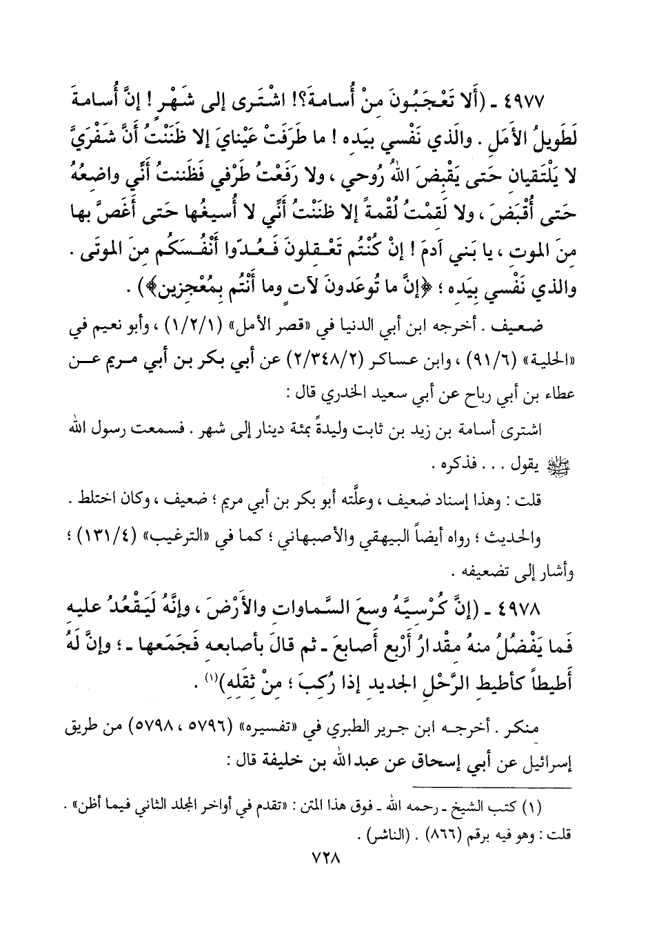 4977 - (ألا تعجبون من أسامة؟! اشترى إلى شهر! إن أسامة لطويل الأمل. والذي نفسي بيده! ما طرفت عيناي إلا ظننت أن شفري لا يلتقيان حتى يقبض الله روحي، ولا رفعت طرفي فظننت أني واضعه حتى أقبض، ولا لقمت إلا ظننت أني لا أسيغها حتى أغص بها من الموت، يا بني آدم! إن كنتم تعقلون فعدوا أنفسكم من الموتى. والذي نفسي بيده؛ (إن ما توعدون لآت وما أنتم بمعجزين)) .
