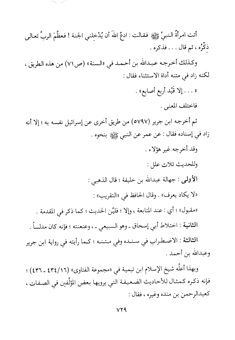 الثالثة: الاضطراب في سنده وفي متنه؛ كما رأيته في رواية ابن جرير وعبد الله بن أحمد.