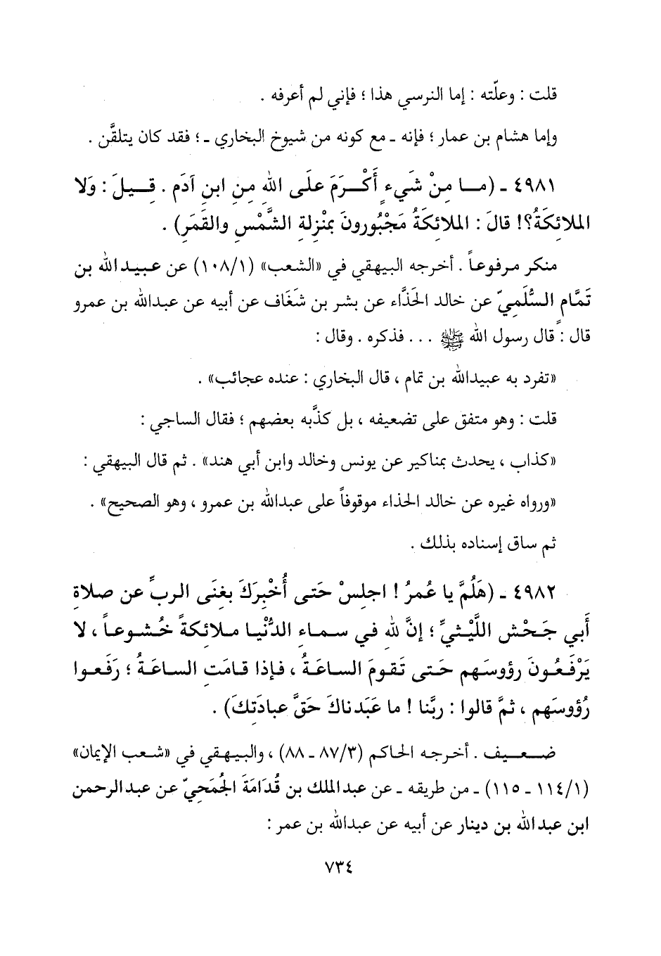 4982 - (هلم يا عمر! اجلس حتى أخبرك بغنى الرب عن صلاة أبي جحش الليثي؛ إن لله في السماء الدنيا ملائكة خشوعاً، لا يرفعون رؤوسهم حتى تقوم الساعة، فإذا قامت الساعة؛ رفعوا رؤوسهم، ثم قالوا: ربنا! ما عبد ناك حق عبادتك) .