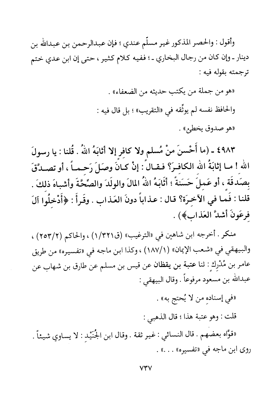 4983 - (ما أحسن من مسلم ولا كافر إلا أثابه الله. قلنا: يا رسول الله! ما إثابة الله الكافر؟ فقال: إن كان وصل رحماً، أو تصدق بصدقة، أو عمل حسنة؛ أثابه الله المال والولد والصحة وأشباه ذلك. قلنا: فما في الآخرة؟ قال: عذاباً دون العذاب. وقرأ: (أدخلوا آل فرعون أشد العذاب)) .