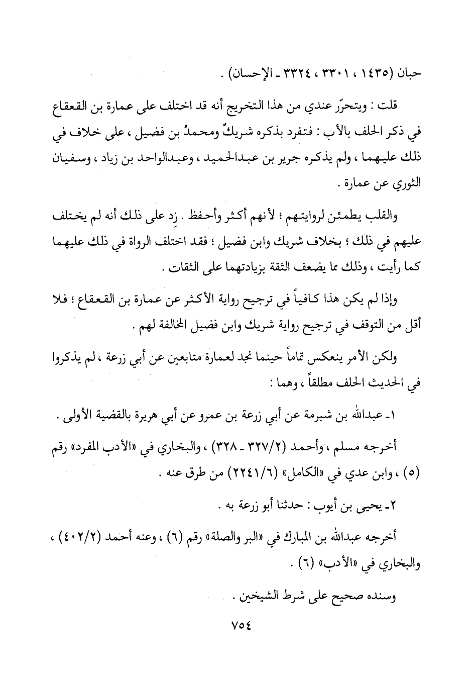 وإذا لم يكن هذا كافياً في ترجيح رواية الأكثر عن عمارة بن القعقاع؛ فلا أقل من التوقف في ترجيح رواية شريك وابن فضيل المخالفة لهم.