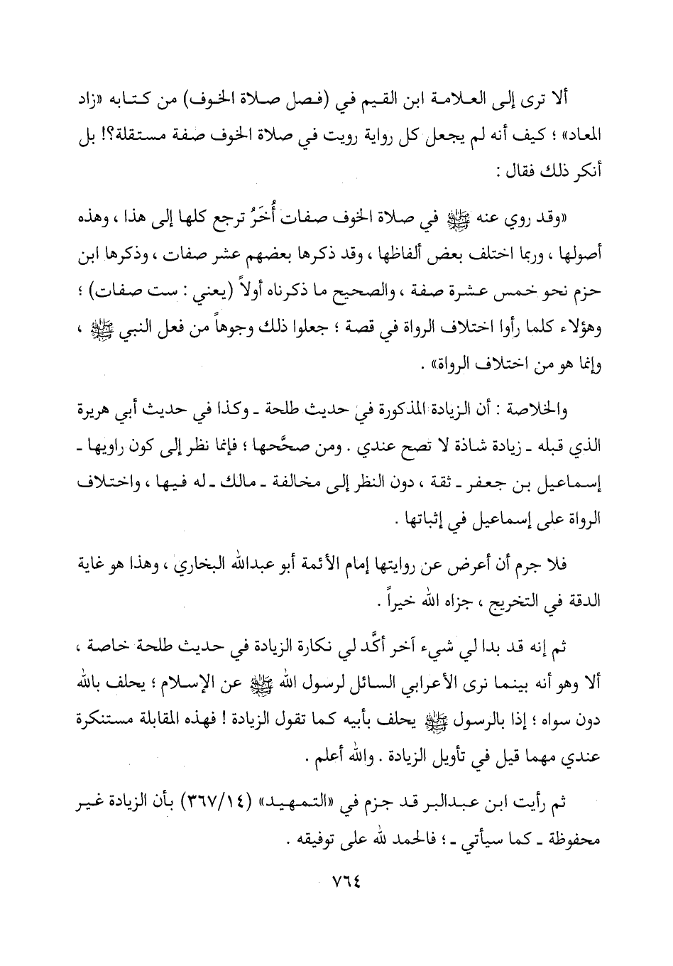 والخلاصة: أن الزيادة المذكورة في حديث طلحة - وكذا في حديث أبي هرية الذي قبله - زيادة شاذة لا تصح عندي. ومن صححها؛ فإنما نظر إلى كون راويها - إسماعيل بن جعفر - ثقة، دون النظر إلى المخالفة - مالك - له فيها، واختلاف الرواة على إسماعيل في إثباتها.