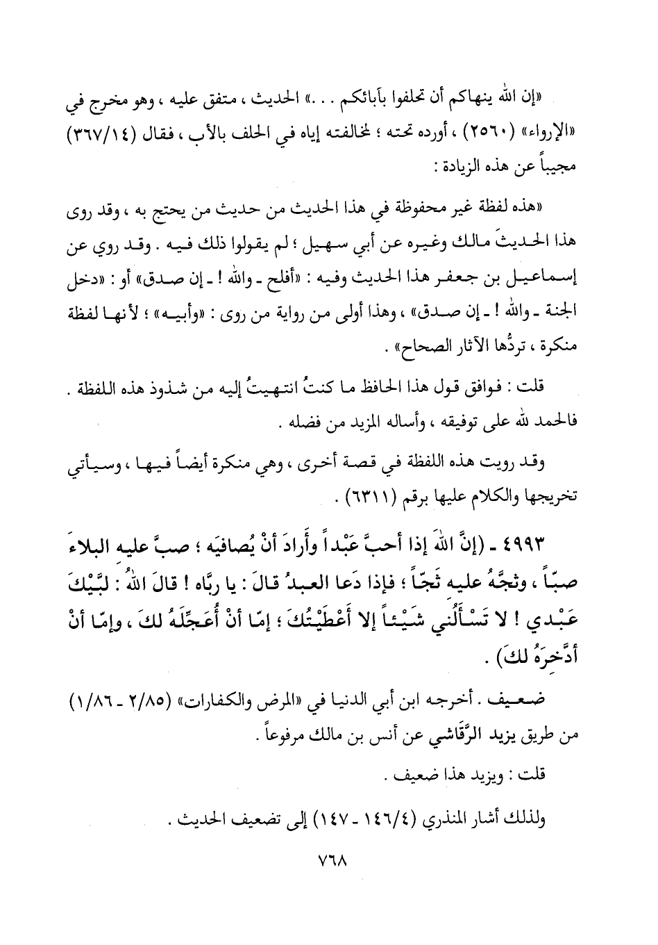 "إن الله ينهاكم أن تحلفوا بآبائكم ... " الحديث، متفق عليه، وهو مخرج في "الإرواء" (2560) ، أورده تحته؛ لمخالفته إياه في الحلف بالأب، فقال (14/ 367) مجيباً عن هذه الزيادة: