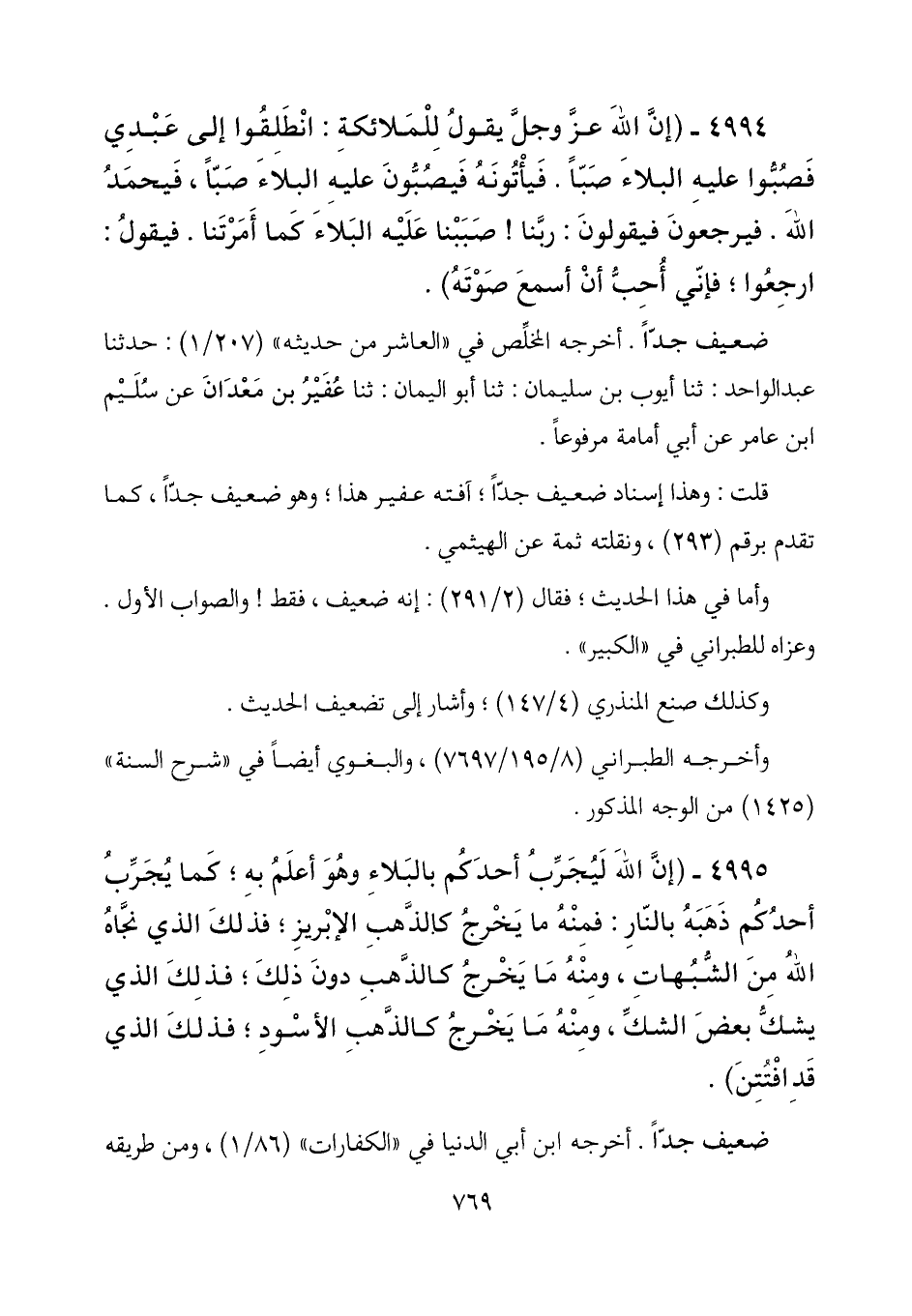 4994 - (إن الله عز وجل يقول للملائكة: انطلقوا إلى عبد ي فصبوا عليه البلاء صباً. فليأتونه فيصبون عليه البلاء صباً، فيحمد الله. فيرجعون فيقولون: ربنا! صببنا عليه البلاء كما أمرتنا. فيقول: ارجعوا؛ فإني أحب أن أسمع صوته) .