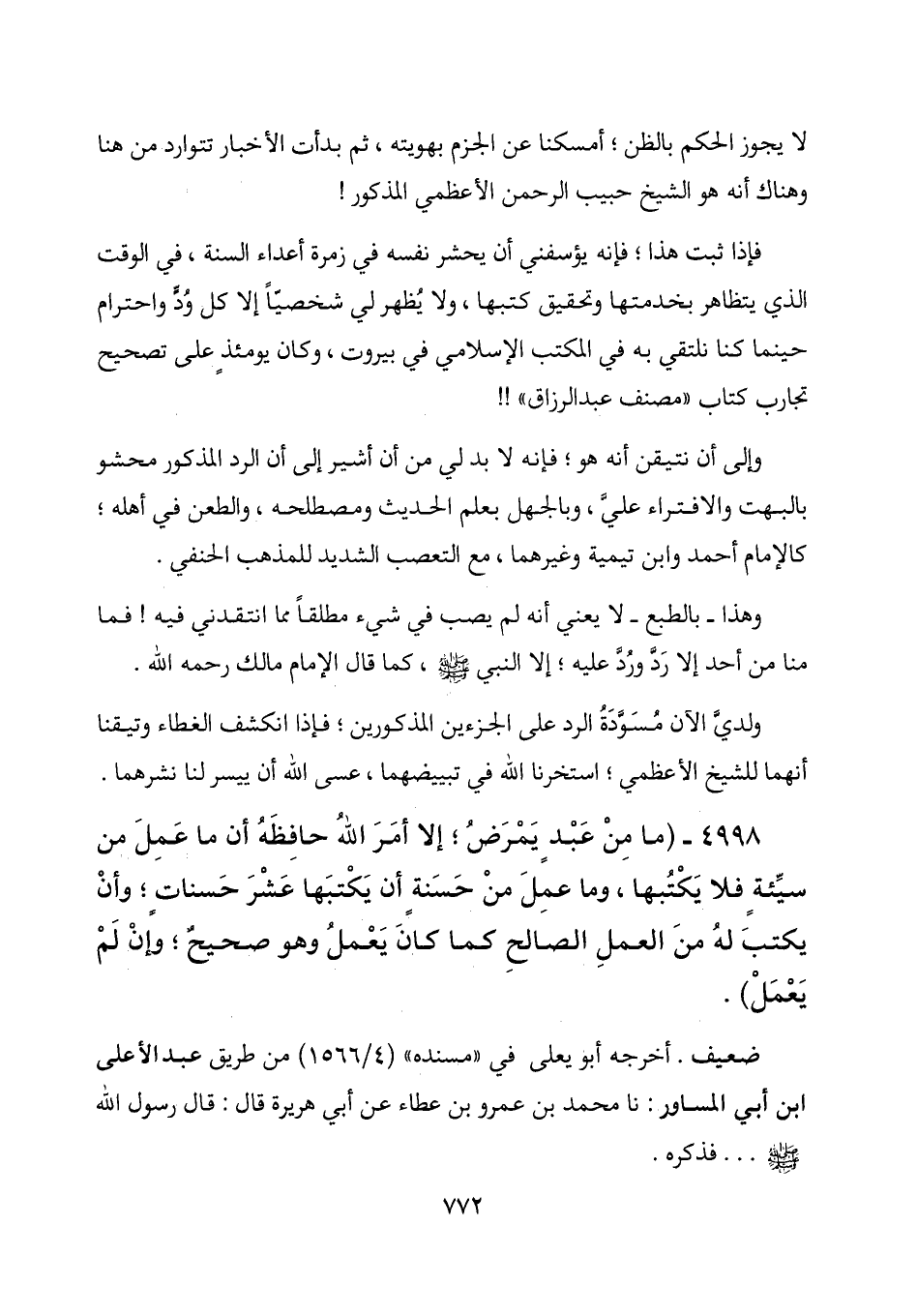 فإذا ثبت هذا؛ فإنه يؤسفني أن يحشر نفسه في زمرة أعداء السنة، في الوقت الذي يتظاهر بخدمتها وتحقيق كتبها، ولا يظهر لي شخصياً إلا كل ود واحترام حينما كنا نلتقي به في المكتب الإسلامي في بيروت، وكان يومئذ على تصحيح تجارب كتاب "مصنف عبد الرزاق"!!
