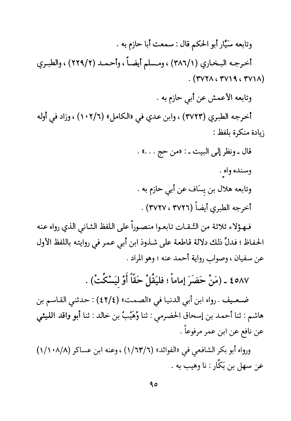 فهؤلاء ثلاثة من الثقات تابعوا منصوراً على اللفظ الثاني الذي رواه عنه الحفاظ؛ فدل ذلك دلالة قاطعة على شذوذ ابن أبي عمر في روايته باللفظ الأول عن سفيان، وصواب رواية أحمد عنه؛ وهو المراد.