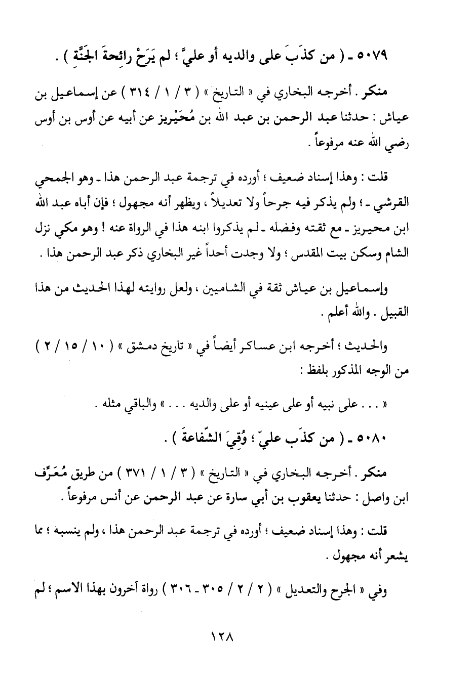 قلت: وهذا إسناد ضعيف؛ أورده في ترجمة عبد الرحمن هذا - وهو الجمحي القرشي -؛ ولم يذكر فيه جرحاً ولا تعديلاً، ويظهر أنه مجهول؛ فإن أباه عبد الله ابن محيريز - مع ثقته وفضله - لم يذكروا ابنه هذا في الرواة عنه! وهو مكي نزل الشام وسكن بيت المقدس؛ ولا وجدت أحداً غير البخاري ذكر عبد الرحمن هذا.