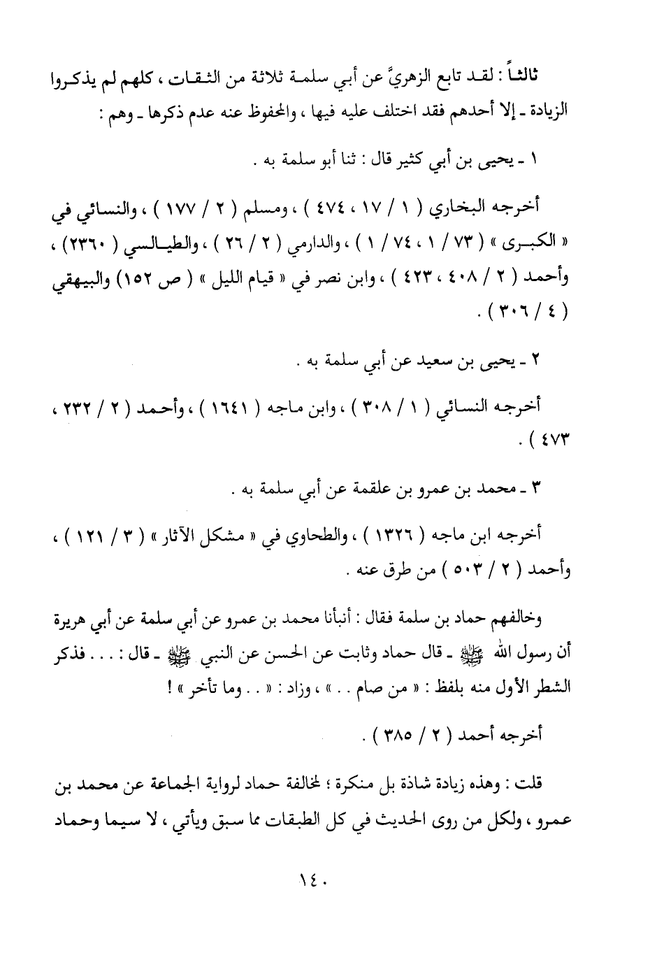 ثالثاً: لقد تابع الزهري عن أبي سلمة ثلاثة من الثقات، كلهم لم يذكروا الزيادة - إلا أحدهم فقد اختلف عليه فيها، والمحفوظ عنه عدم ذكرها - وهم: