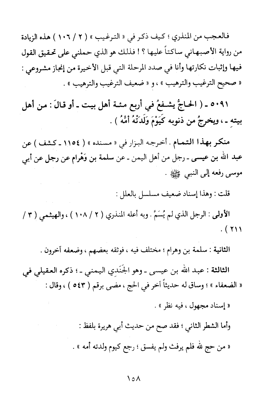 فالعجب من المنذري؛ كيف ذكر في "الترغيب" (2/ 106) هذه الزيادة من رواية الأصبهاني ساكتاً عليها؟! فذلك هو الذي حملني على تحقيق القول فيها وإثبات نكارتها وأنا في صدد المرحلة التي قبل الأخيرة من إنجاز مشروعي: "صحيح الترغيب والترهيب"، و "ضعيف الترغيب والترهيب".