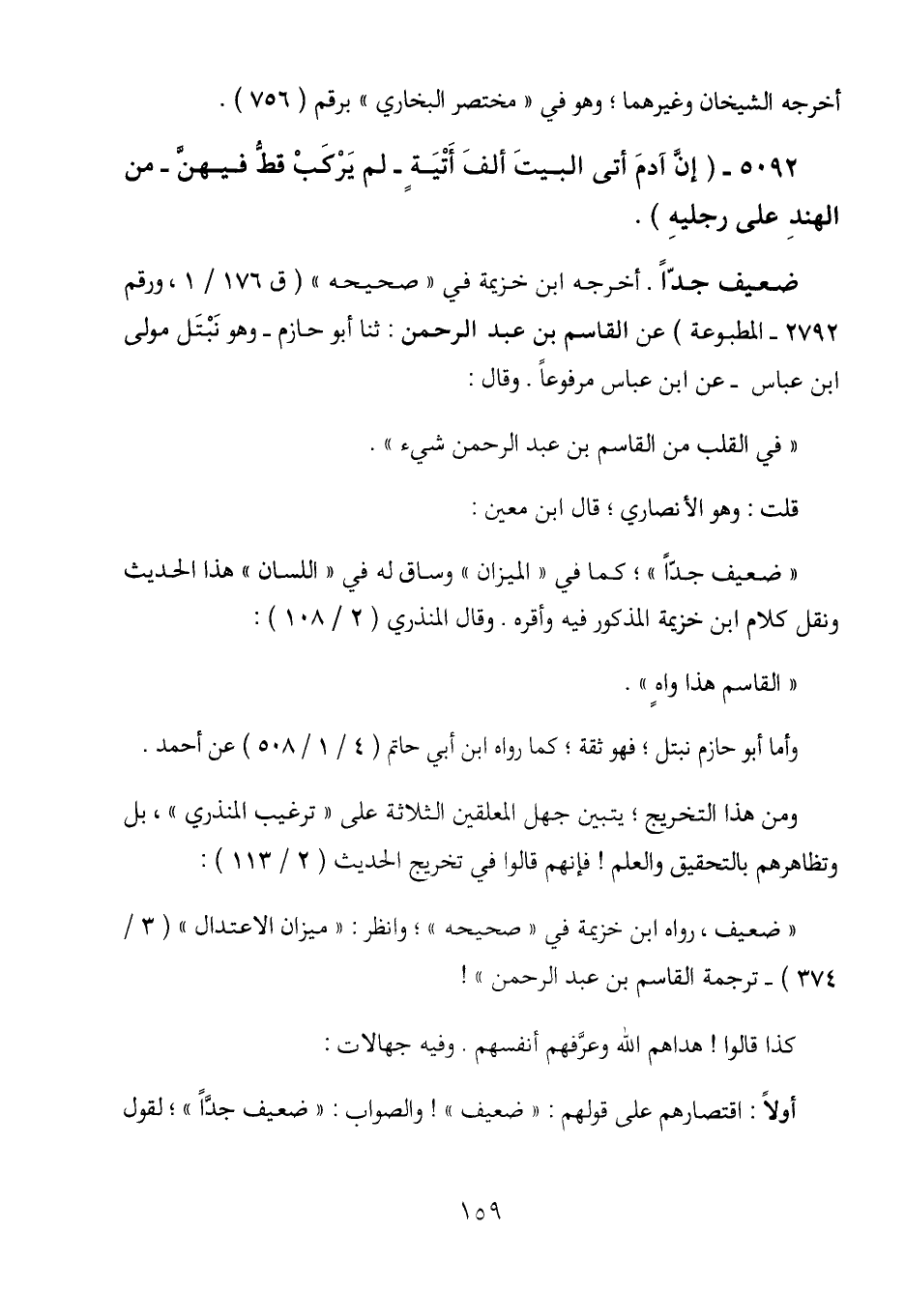 أولاً: اقتصارهم على قولهم: "ضعيف"! والصواب: "ضعيف جداً"؛ لقول