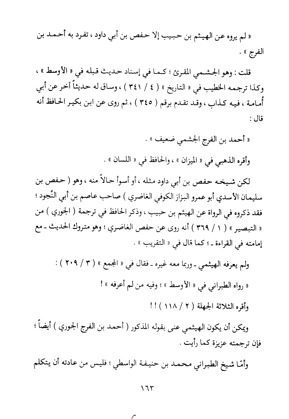 ويمكن أن يكون الهيثمي عنى بقوله المذكور (أحمد بن الفرج الجوري) أيضاً؛ فإن ترجمته عزيزة كما رأيت.