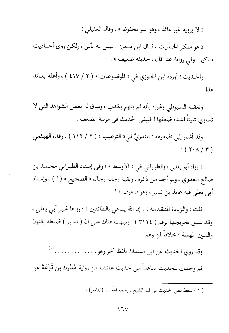 وتعقبه السيوطي وغيره بأنه لم يتهم بكذب، وساق له بعض الشواهد التي لا تساوي شيئاً لشدة ضعفها! فيبقى الحديث في مرتبة الضعف.